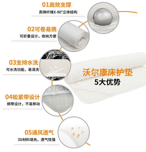 沃爾康3D床護墊四周還設計優質的松緊帶,可牢牢固定防止滑動移位,再也無需頻頻整理床單。夜晚蓋被太多容易出汗,沃爾康床護墊輕薄透氣,排濕性能好,不用擔心被窩潮濕難受。沃爾康3D床護墊清洗方便,可直接沖洗,水流秒過,讓床上用品時刻保持干凈清爽。